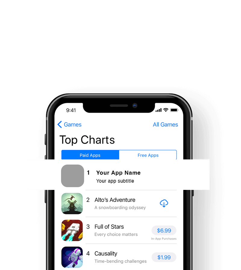 Our ASO team will help your app improve search rankings through keyword and metadata optimization, boost conversion rates via A/B testing, and optimize user acquisition.
